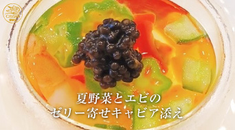 夏野菜とエビのゼリー寄せキャビア添え