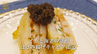 イカと海老の蓮根はさみ揚げキャビア添え